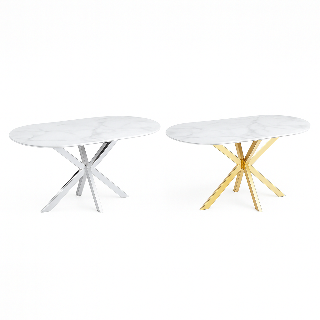 Keramische Marmoroptik-Tischplatte – kratz- und hitzebeständig, pflegeleicht Stabiles Metallgestell – wahlweise in Gold oder Silber, modernes Kreuzfußdesign In mehreren Größen erhältlich – 150, 180 und 200 cm Großzügiger Sitzkomfort – Platz für 4 bis 8 Personen Luxuriöses Design-Statement – vereint Eleganz und Funktionalität