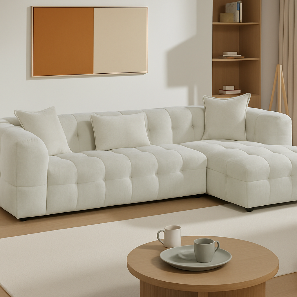 • Luxuriöse gesteppte Polsterung: Verleiht der Sitzecke Tiefe und Charakter • Großzügige Sitzfläche: Ideal zum Loungen, Entspannen oder für Gäste • Inklusive weicher Kissen: Für zusätzlichen Komfort und Unterstützung • Cremefarbener Stoff: Zeitlos und leicht mit jedem Einrichtungsstil kombinierbar • Stabile Konstruktion: Robuster Holzrahmen mit unauffälligen schwarzen Füßen